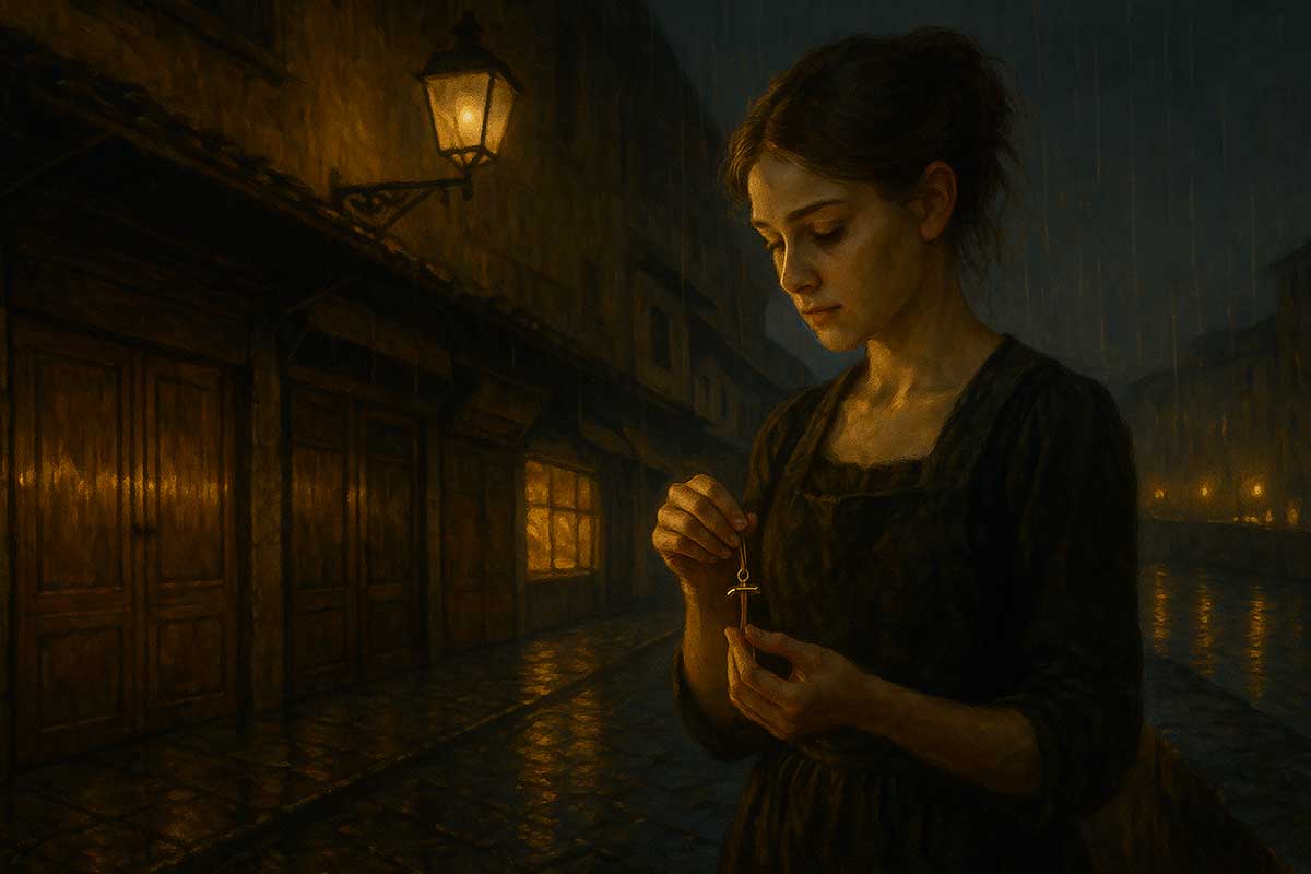 A Spanish traveler grieving the collapse of her relationship and sense of direction. Drawn to the Ponte Vecchio at midnight, she receives a simple brass key and the courage to begin again—one small step at a time.