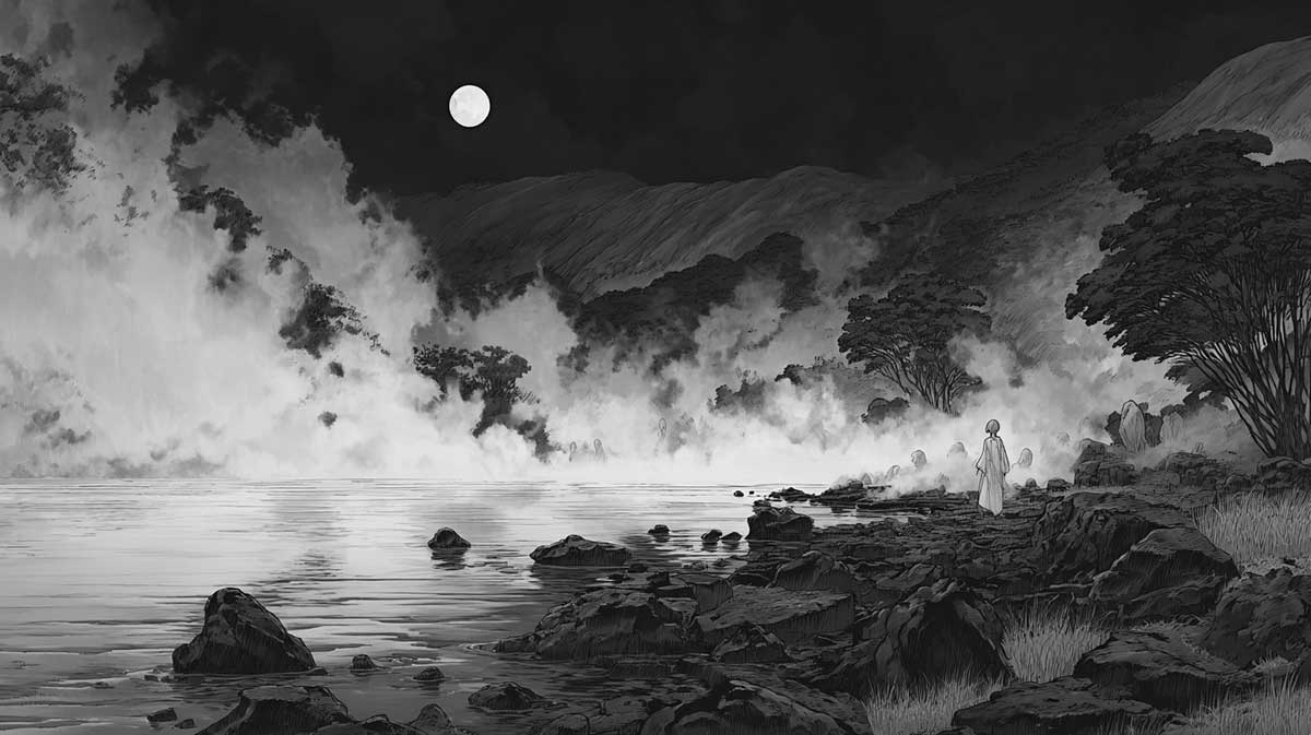 Travelers approaching Osorezan on stormy nights sometimes report seeing a figure in white wandering the lakeside, cradling a child made of wind and light.