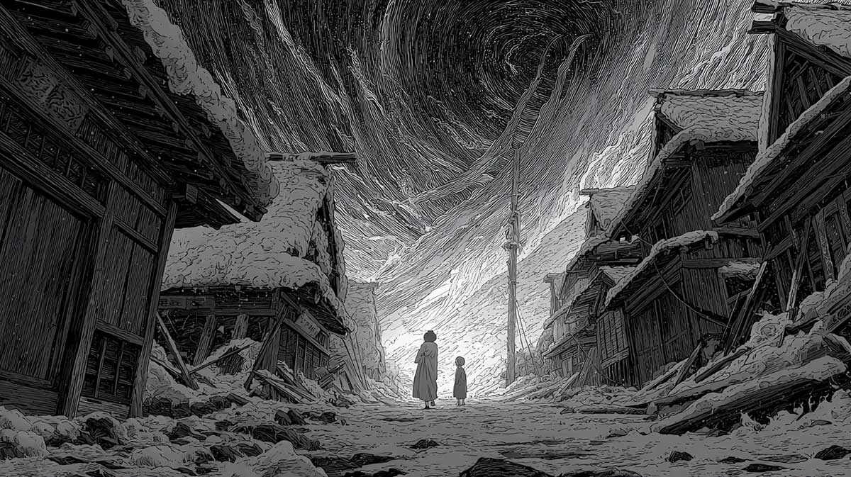 It was five winters ago, during a storm blowing down from Osorezan’s blasted slopes. As Tetsuro made his way home along the frozen path, a faint cry rose from the wind—a cry too human to ignore. Following the sound, he found a collapsed bridge and, beside it, a young woman in a white pilgrim’s robe.