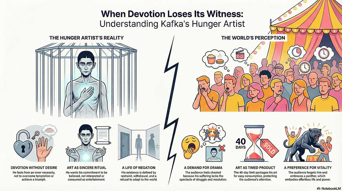 Without appearance, remembrance, or narrative, even the most sincere life remains unfinished. The hunger artist’s devotion never becomes a story others can carry forward.