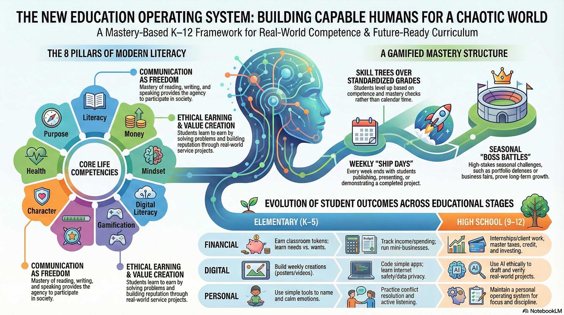 A mastery-based, gamified, project-driven K–12 system that trains students to become capable humans who can read, communicate, earn ethically, self-regulate, create with technology, live with character, protect their health and attention, and navigate life with purpose.