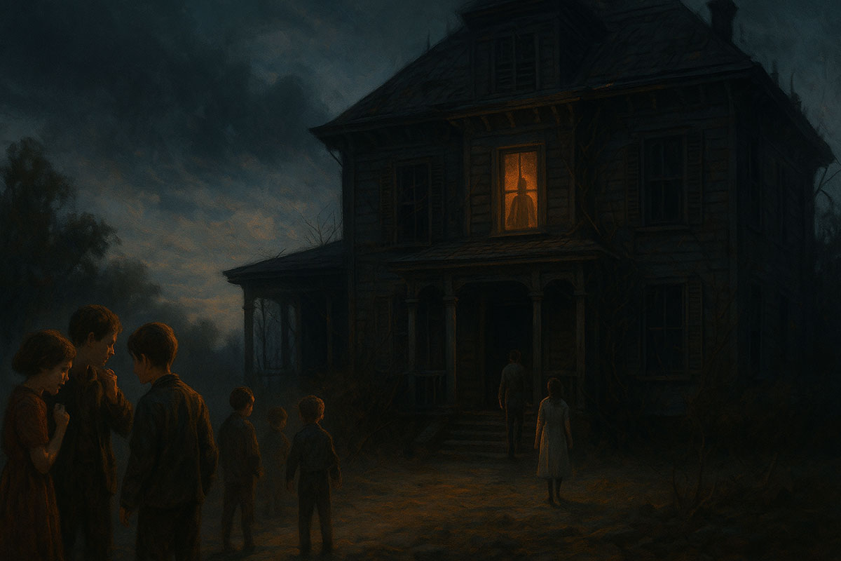 [The upstairs window glows brightly. A shadow appears—tall, thin, unmistakably Emily’s silhouette. She raises her hand slowly, palm outward, as if in benediction or warning. Then the light extinguishes.]