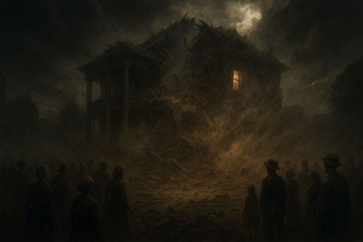 [The crowd rushes. The SUCCESSOR HISTORIAN lingers, staring transfixed at the bed. The MAYOR drags him out as the house begins to cave inward. With a thunderous crash, the mansion collapses, sending dust and debris across the stage.]