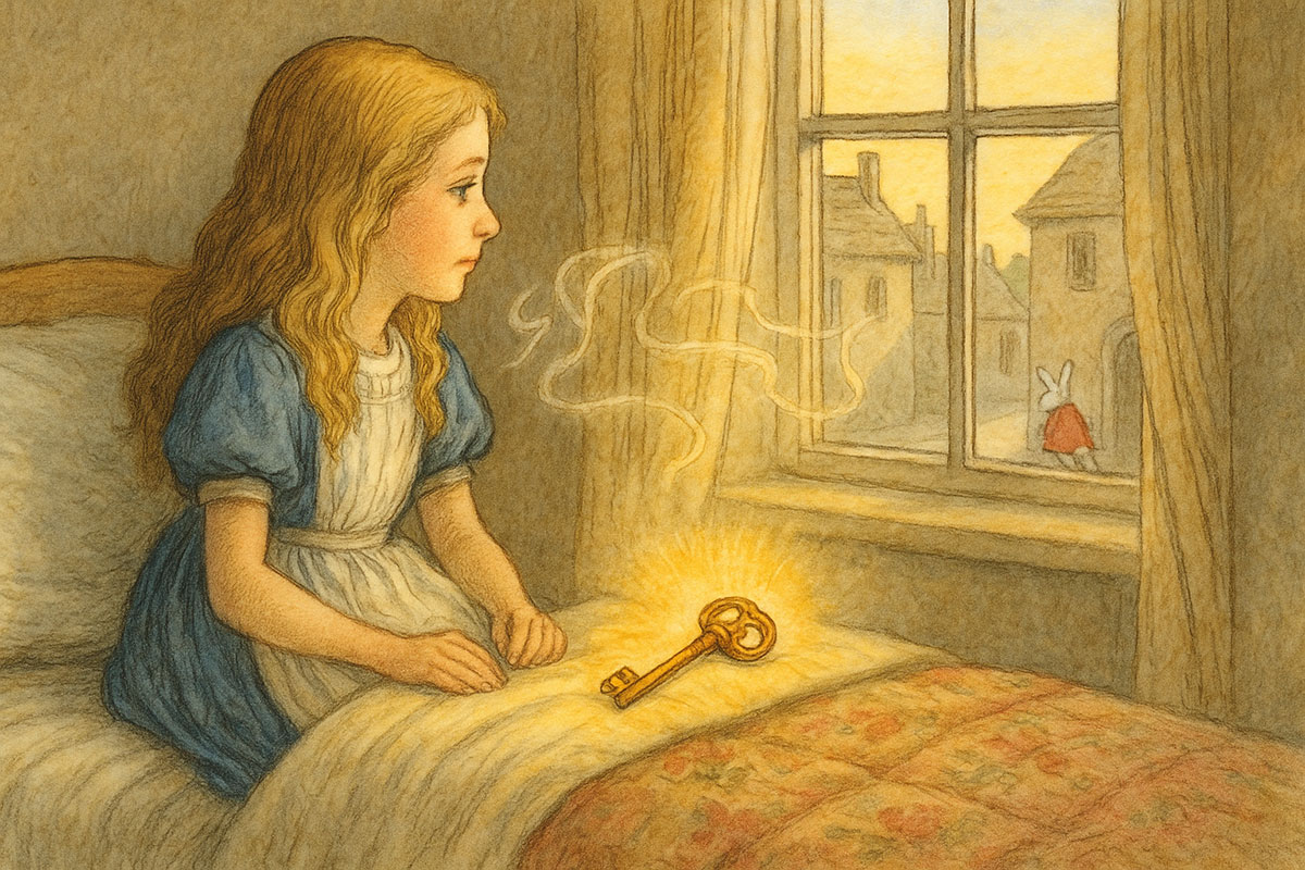 Alice was halfway between a yawn and a thought when the mantel clock sneezed—three polite "tish-choos!"—and spat out a brass key that landed on her pillow with a curtsey.