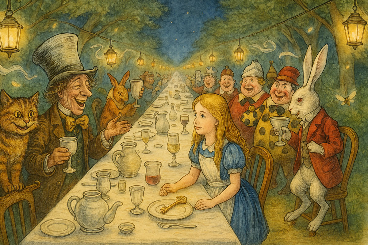The Hatter faded mid-toast, but his smile lingered like Cheshire cats do.
