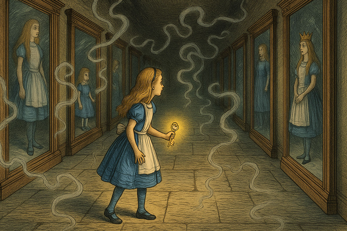 Alice tapped each with her key. They slid aside, revealing smaller halls filled with echoes—caterpillar smoke asking "Who are you?", a trumpet hiccupping through "Off with—", invisible chalk writing "Why is a raven like a writing desk?"