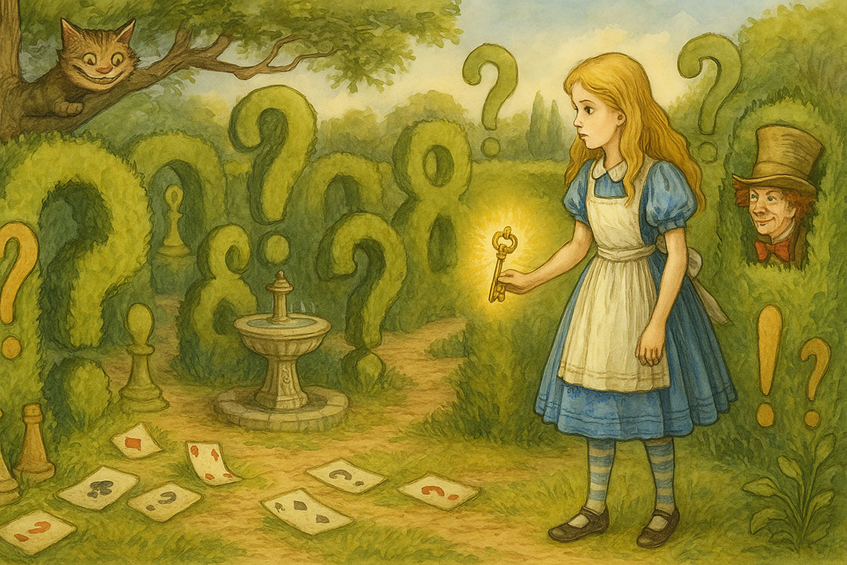 The door opened onto a garden where hedges grew in the shapes of questions. At its heart, a fountain bubbled riddles instead of water, and beyond the garden, Alice could see a river of golden sand flowing endlessly under an impossible sunset.