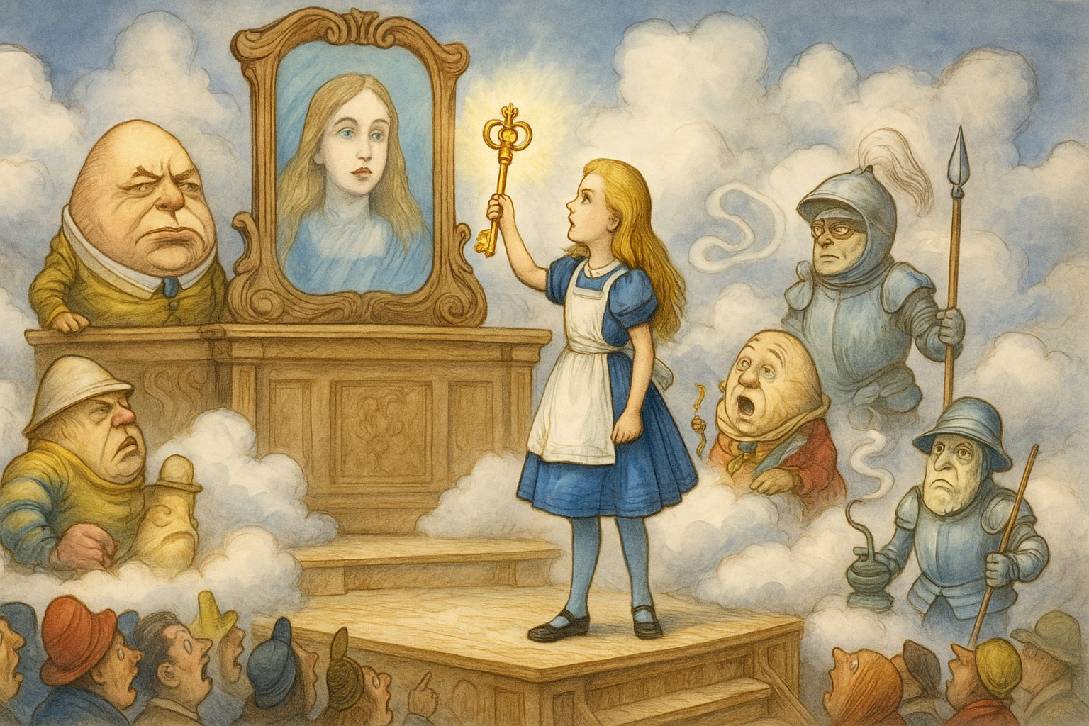 Humpty Dumpty: Pride shaped like an egg. His great fall taught him nothing, which is itself a lesson. He shows Alice what happens when we sit too high, too certain, defining words instead of letting words define themselves.