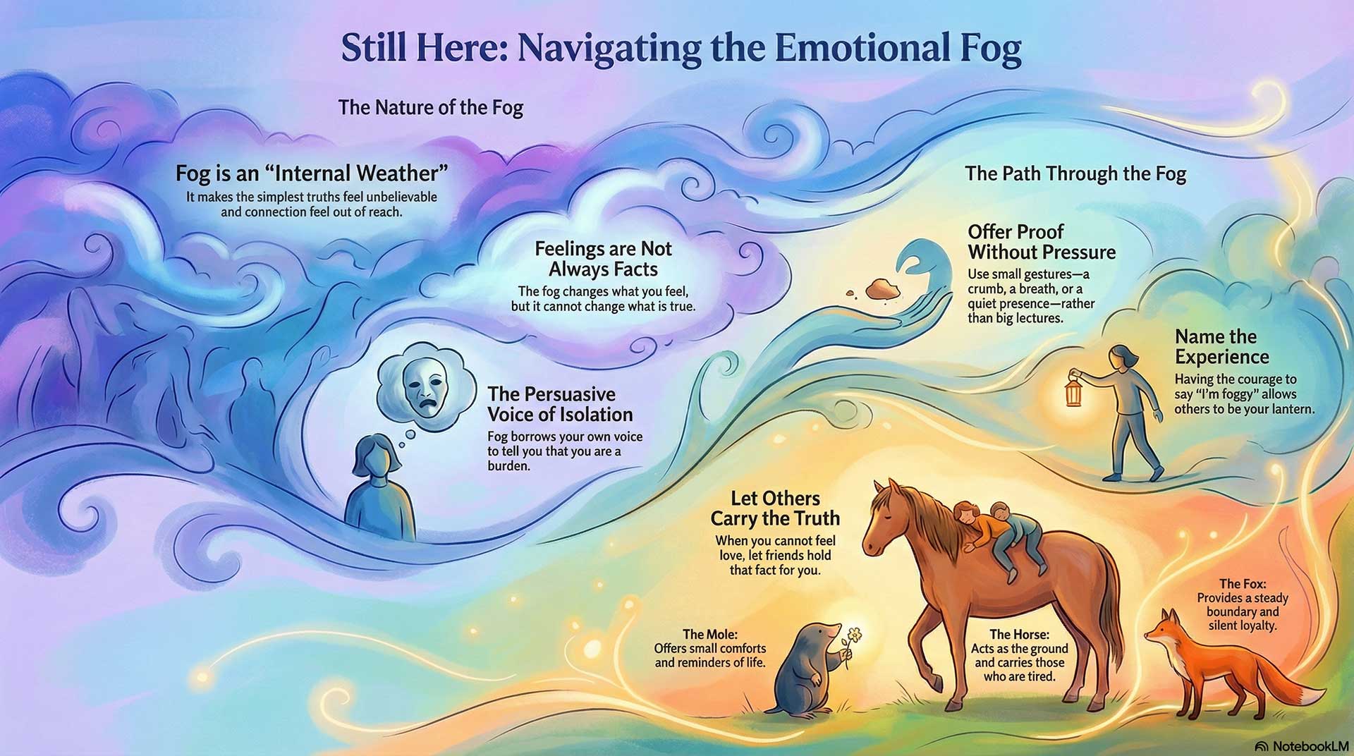 Fog is persuasive because it borrows your own voice. It tells you that you are a burden, that kindness is pretend, that you are separate, even when you are held. It can make the world look the same and feel completely different. And that is frightening.