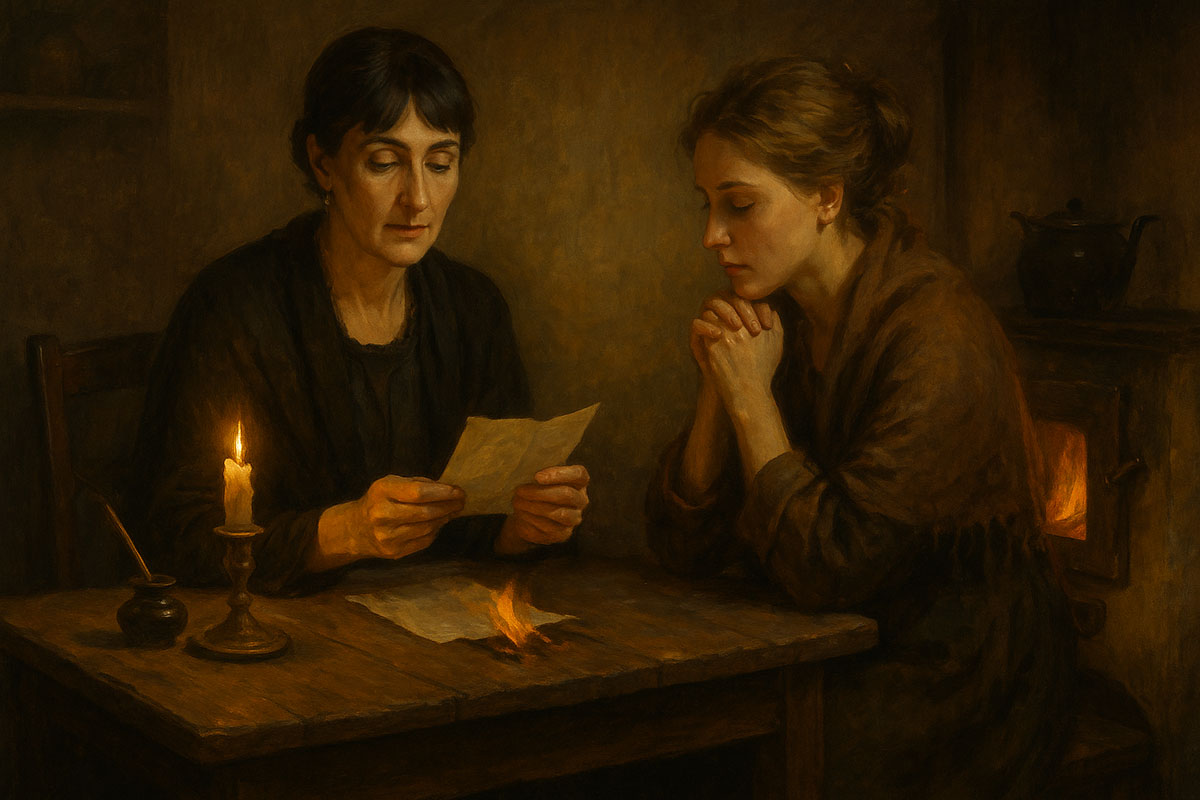 The room seemed to shrink around us. Outside, the muffled sound of horse hooves on snow went on, indifferent. I reached across the table, but you did not move toward me. Your eyes were fixed on the chipped rim of your teacup, as if it might keep you from drowning.