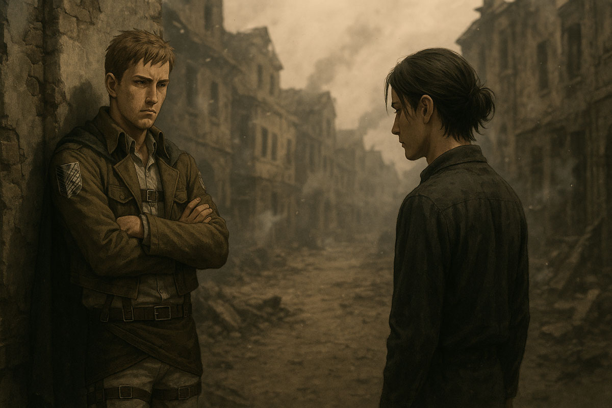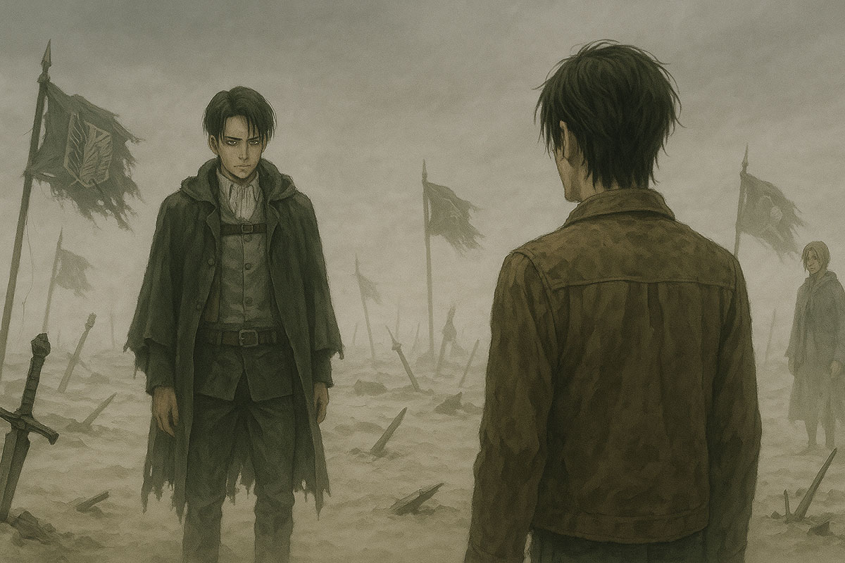 Levi stood among the wreckage, coat torn but posture unshaken. His eyes followed Eren with the calm weight of someone who’d already seen too many endings.