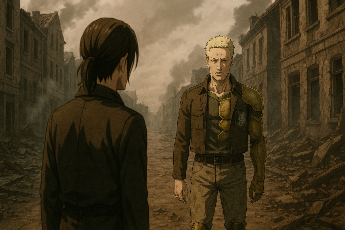 Smoke curled from shattered buildings. Reiner stood in the center, armor half-formed, face drawn.