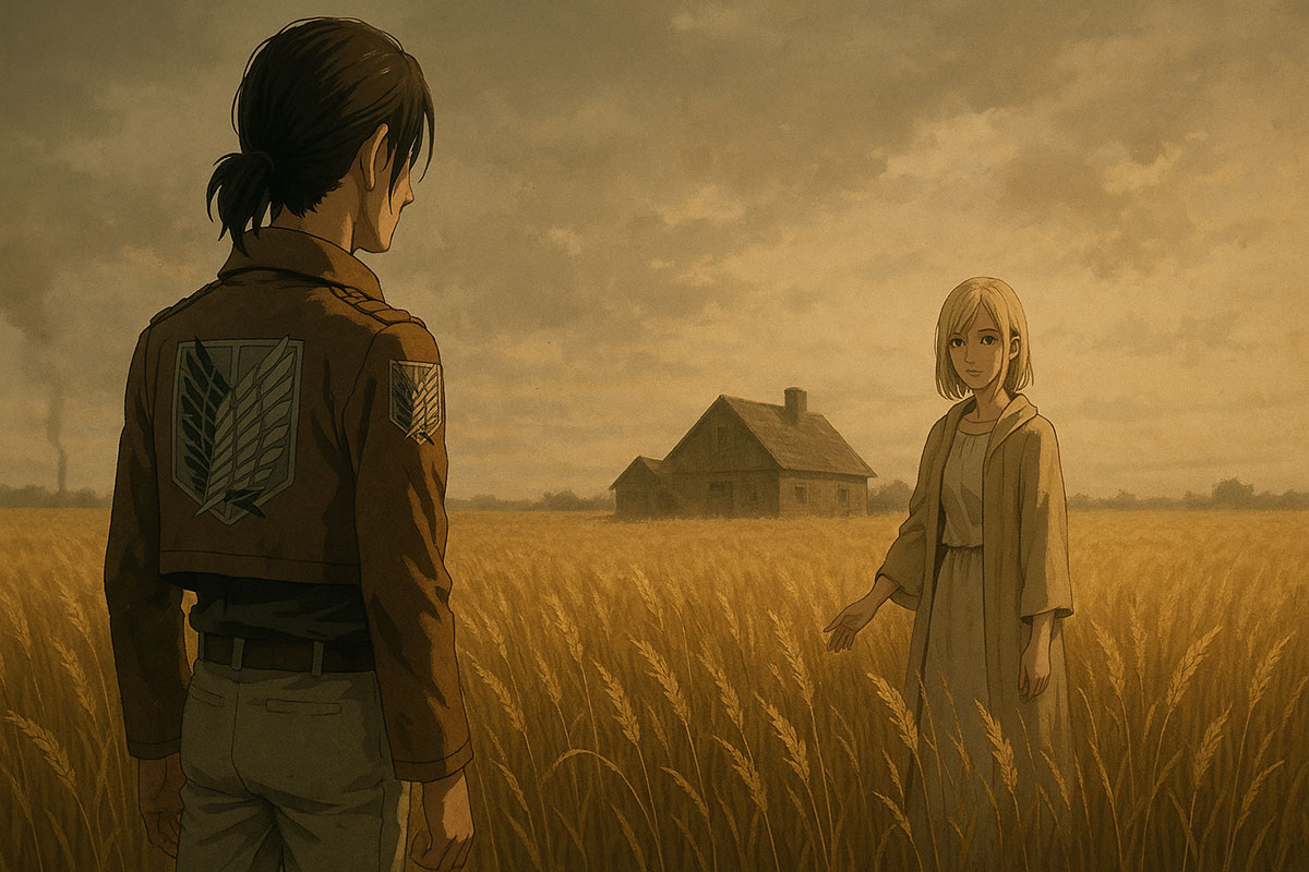 Golden wheat swayed under an unmoving sky. A farmhouse sat solitary in the distance. Historia stood at the edge of the field, fingertips brushing the grain.