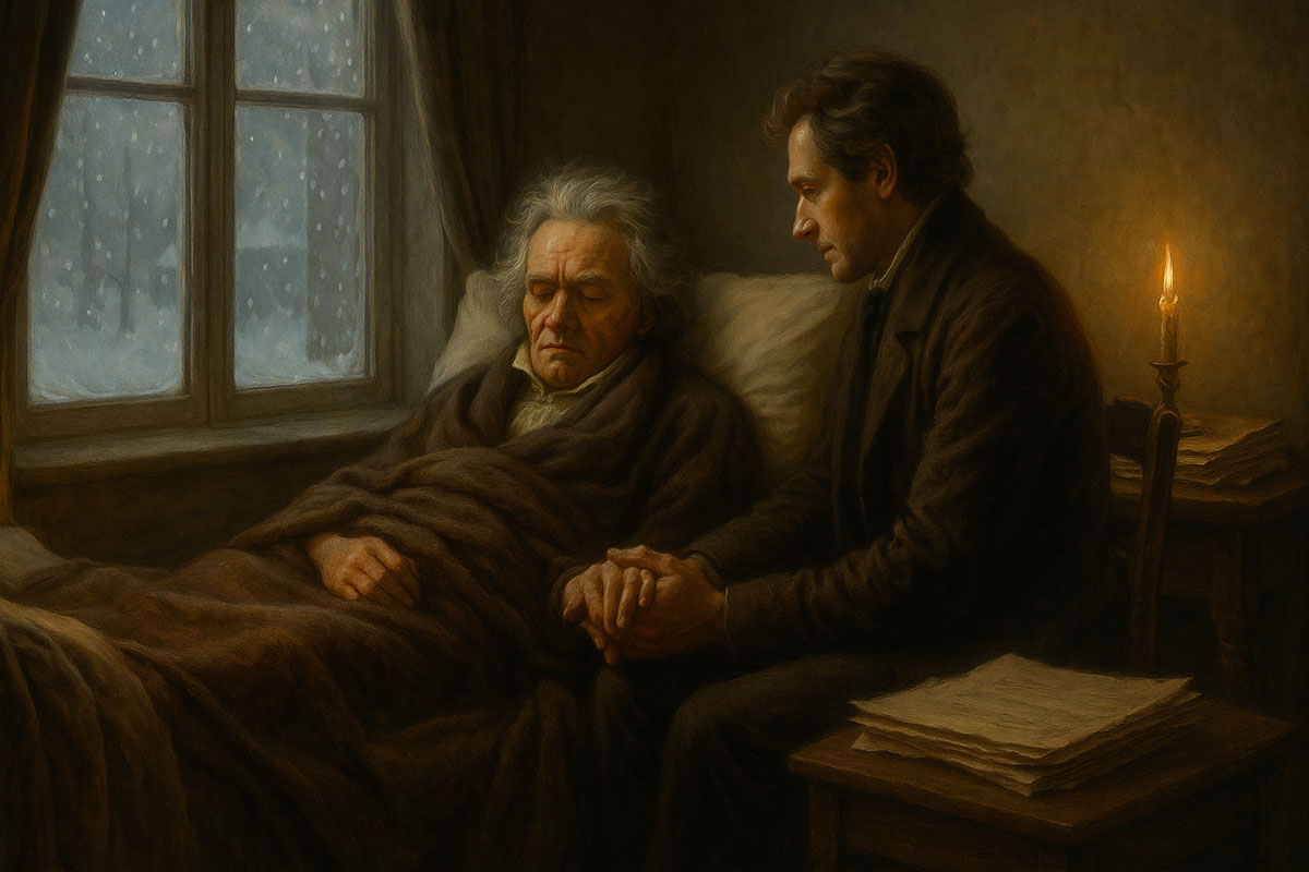 Beethoven lay beneath thick wool blankets, barely more than a shadow of the titan he once was. His face had thinned. His once-strong hands—those hands that had thundered across pianos, scribbled frantic notes into margins, gripped baton and manuscript—now trembled as they reached for nothing in particular.