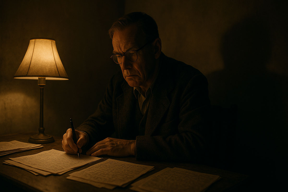 The manuscript lay open on the desk, its pages scattered like fallen leaves after a storm. Czesław leaned over them, his brow furrowed, pen trembling in his hand. The lamp cast a narrow circle of light, but beyond it, the room felt cavernous, as though shadows themselves were listening.