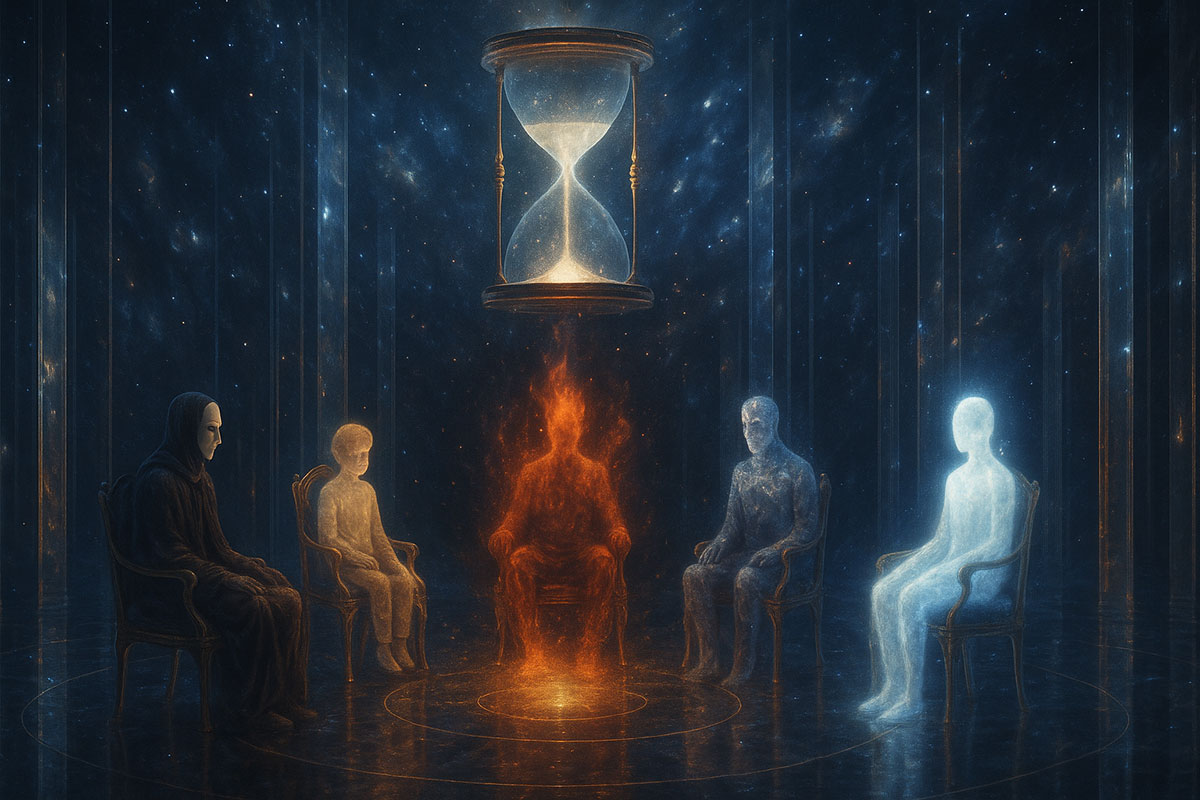 The stage is circular, dimly lit like a psychological amphitheater. Five chairs face inward, each occupied by a version of the same being. A symbol above reads: “Know Thyself.”