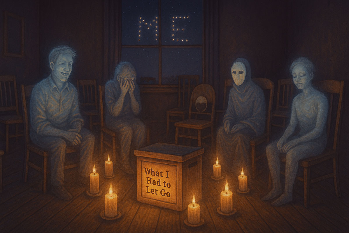 (Each character lights a candle and places it in the box labeled “What I Had to Let Go.” The box fades to light. Then into the word: “Me.”)