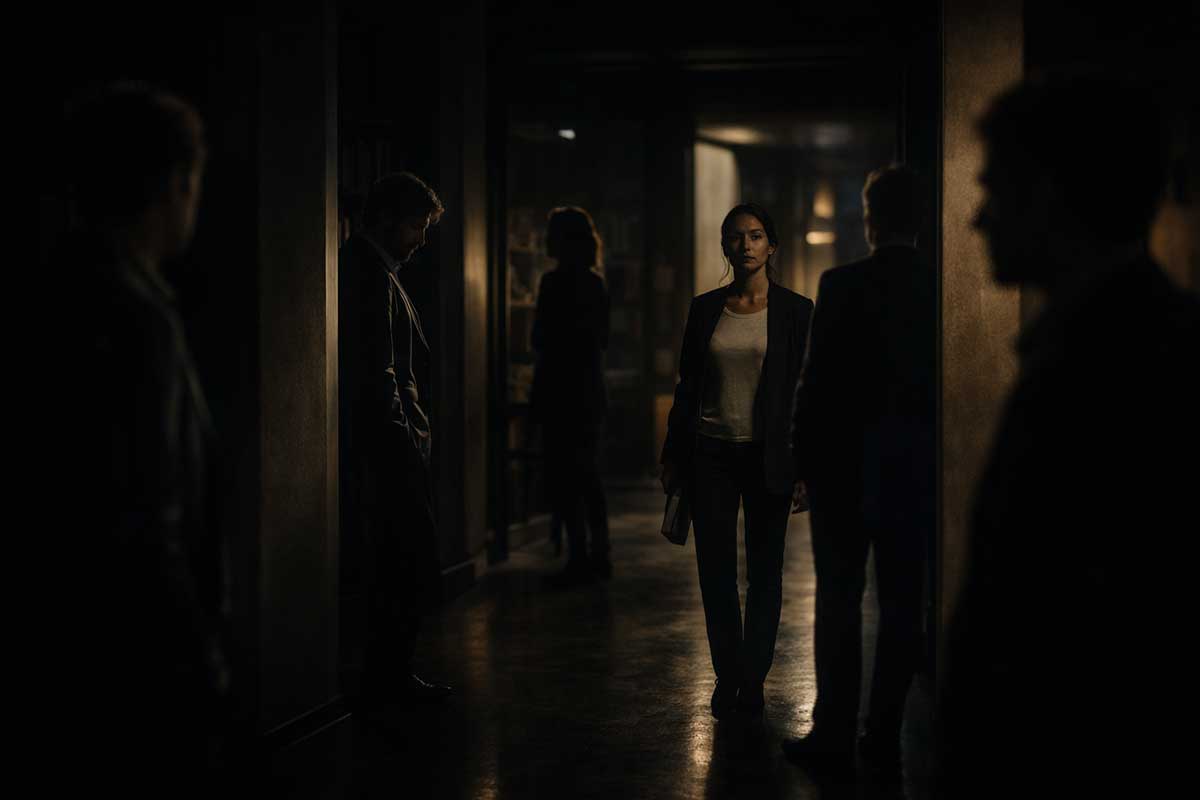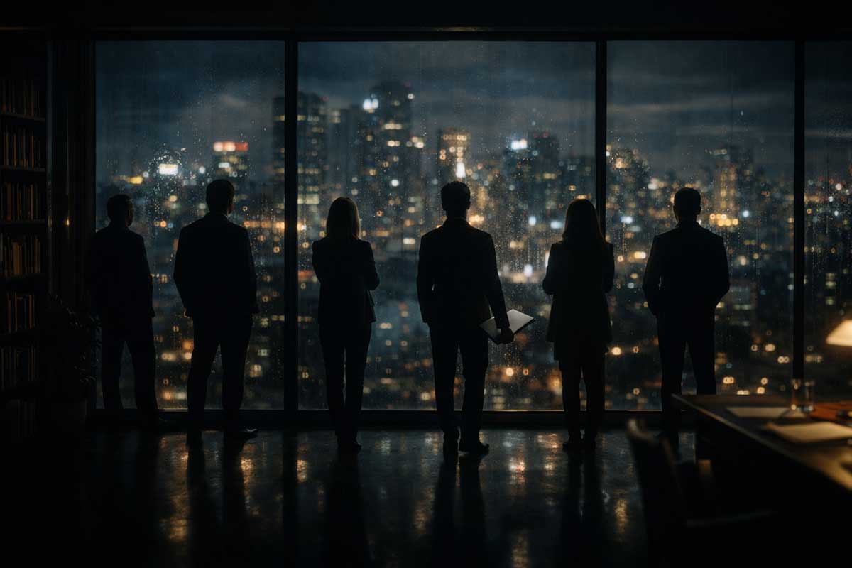 News screens flicker silently in the distance.