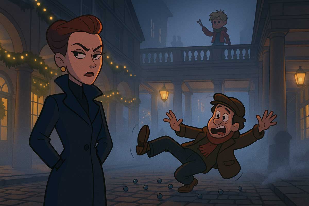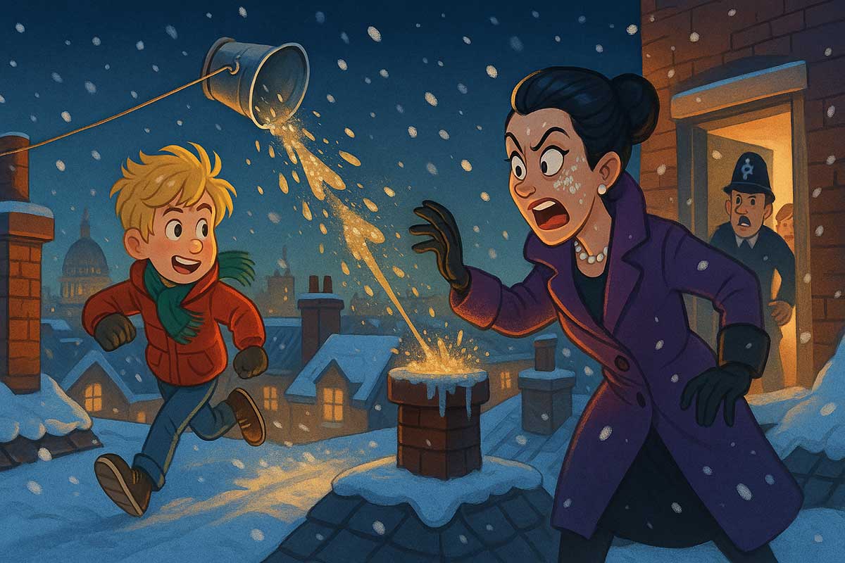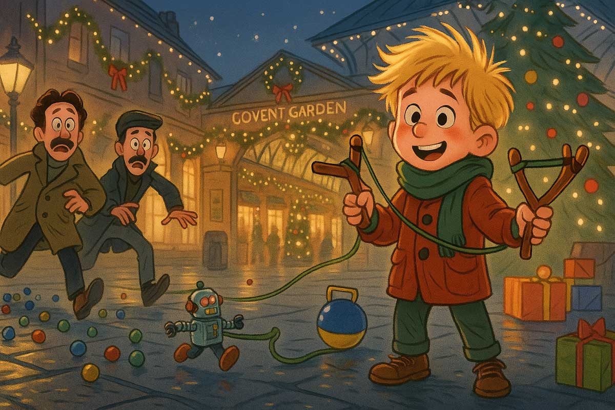 The lobby of the London-bound hotel looked calm from the outside — elegant chandeliers, polished floors, and wreaths hanging neatly over the doors. Inside, however, the McCallisters were supplying enough chaos to power the entire British National Grid.