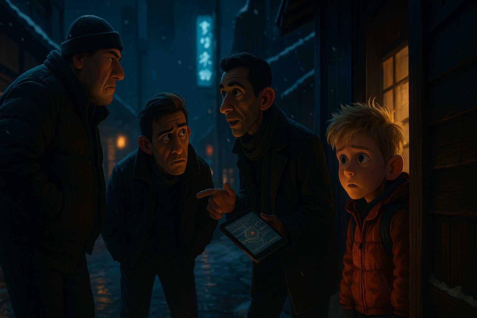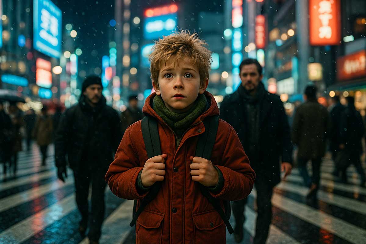 A swirl of international faces who reflect the size, diversity, and energy of Tokyo. Their presence emphasizes Kevin’s smallness — and the vastness of the world he suddenly has to navigate alone.