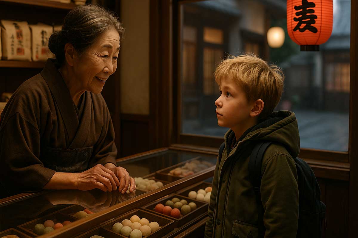 A gentle, elderly wagashi shop owner in Tokyo who shows Kevin unexpected kindness. Warm, patient, and wise, she becomes the emotional anchor of Kevin’s journey — offering comfort, food, and a glimpse into the heart of Japanese hospitality.
