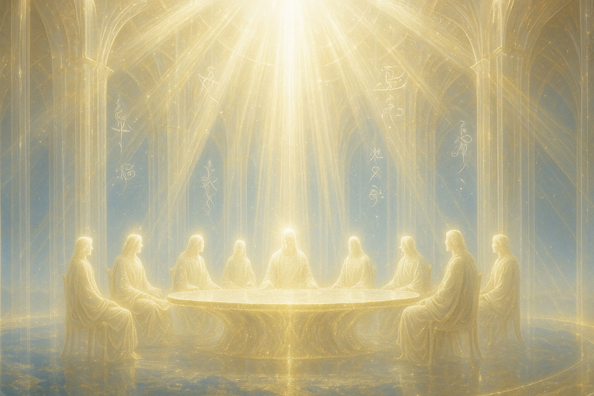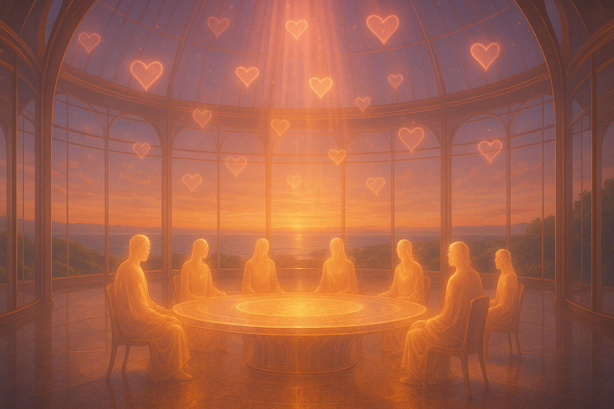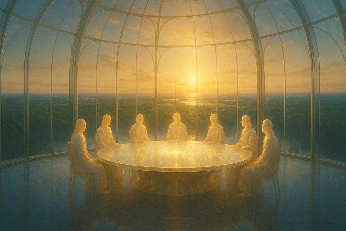 A translucent glass hall overlooks vast green continents, sparkling oceans, and skies so clear they seem unreal. Floating holograms display symbols of every spiritual and philosophical tradition. The roundtable at the center is made of soft white light that shifts like living crystal.