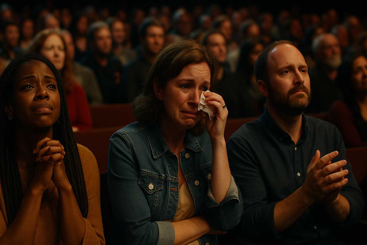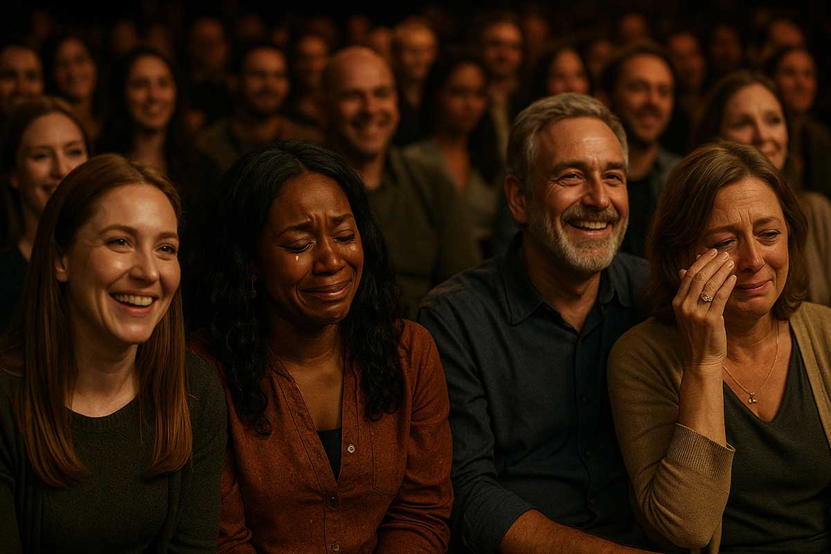(Lights fade. Standing ovation rises in waves. God smiles — a tear glows in divine light.)