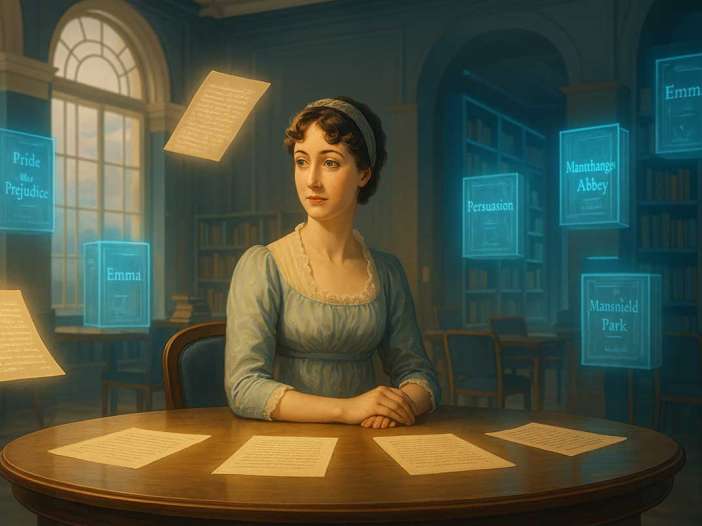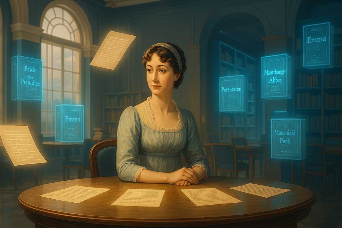 (Austen smiles faintly, the candlelight of 1813 flickering across a holographic 2025 studio. Her voice is as sharp as it is tender.)