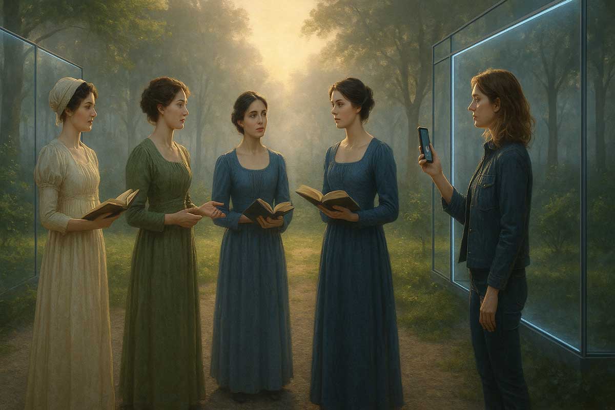 (The scene opens in a tranquil garden—half Regency, half digital—where roses bloom beside glowing laptop screens. Jane Austen adjusts her bonnet with a wry smile.)