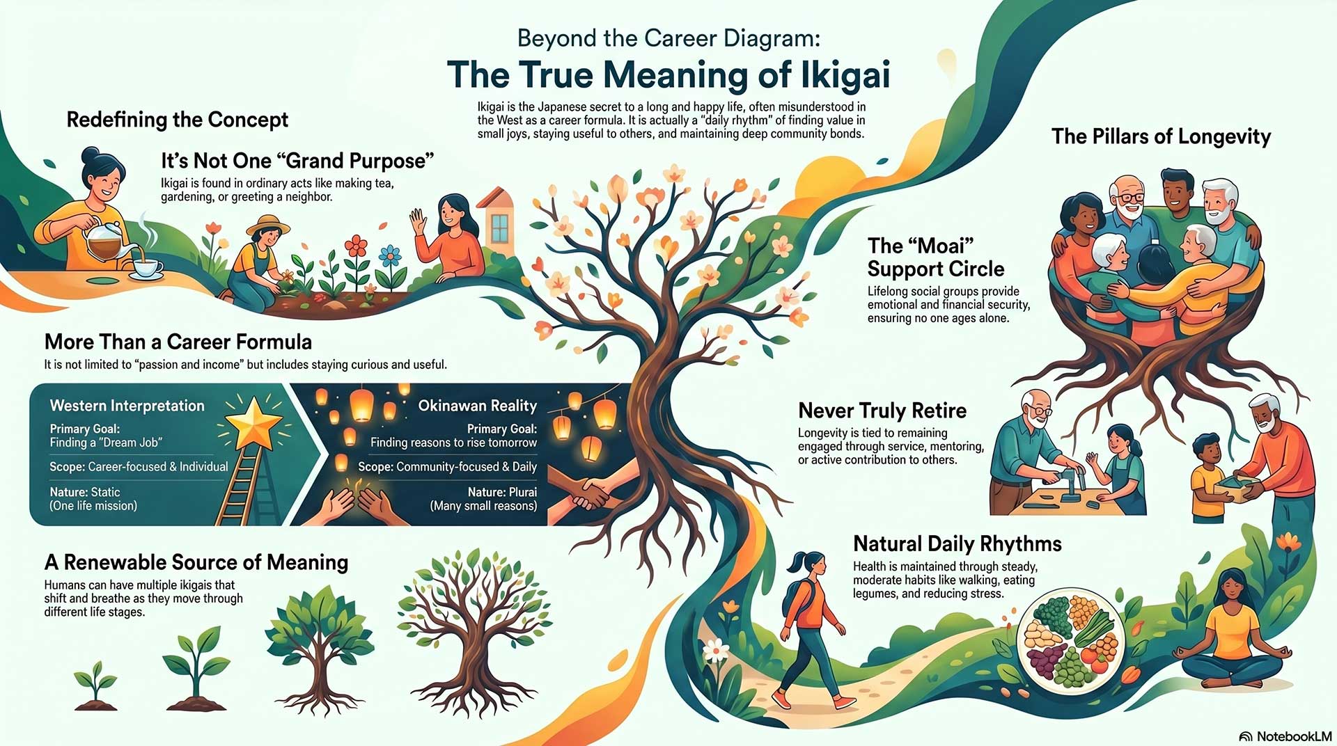 Inspired by Ikigai: The Japanese Secret to a Long and Happy Life, we explored five dimensions of a life that continues with meaning: