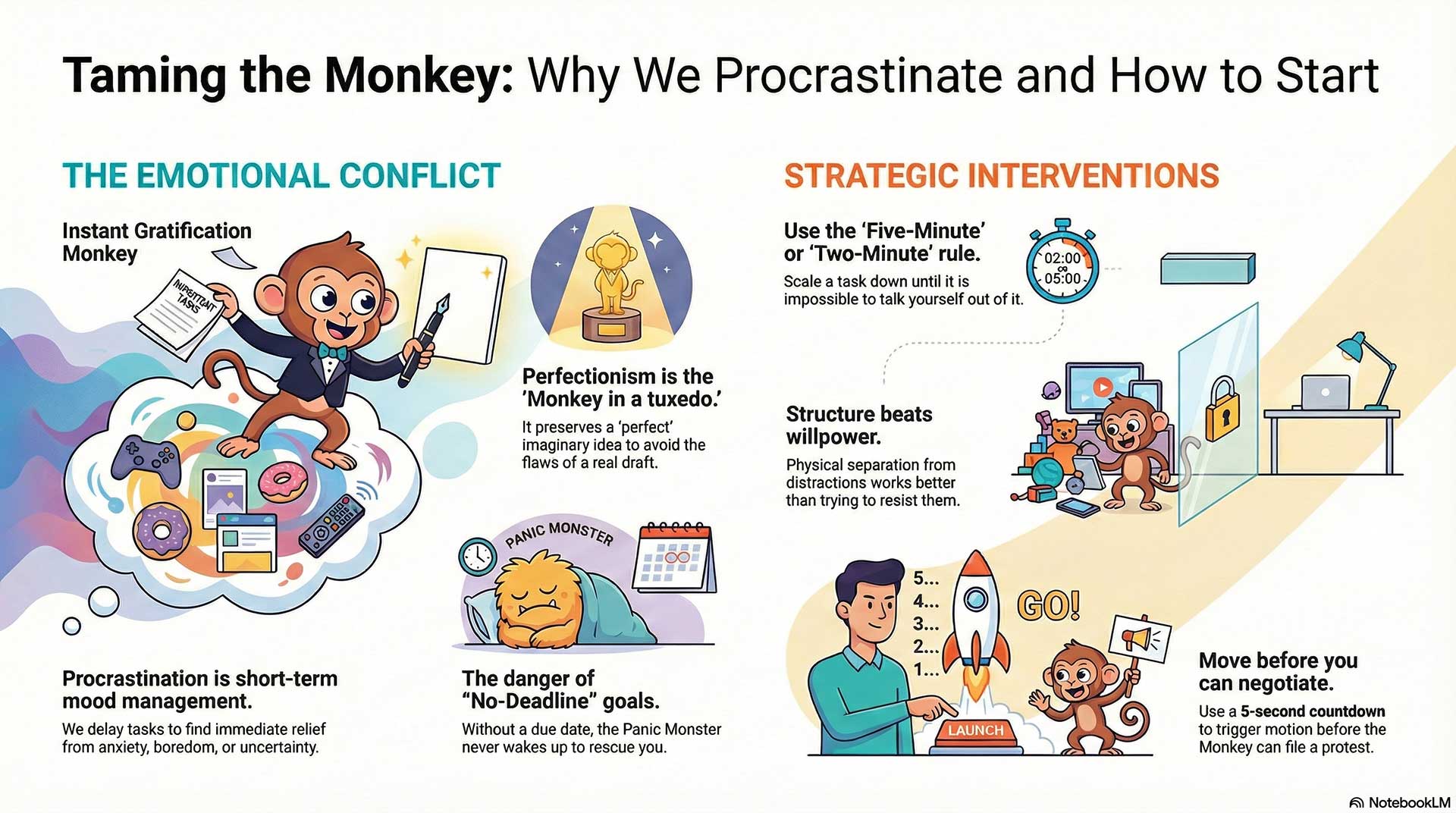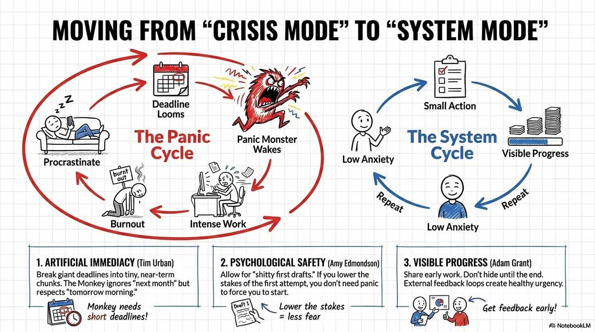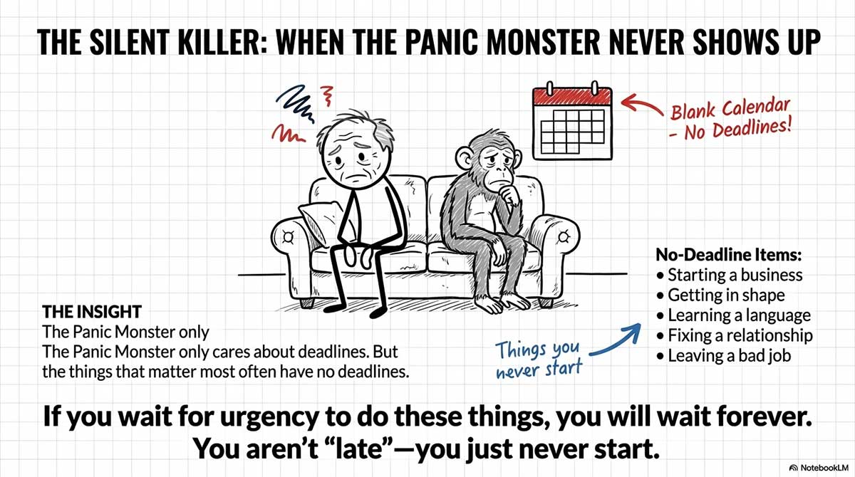 Because the Panic Monster is basically a deadline creature. If there’s no due date, it stays asleep. So the Monkey runs the show forever.
