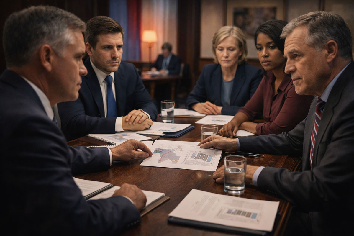 The room is not the House chamber. No applause signs, no camera pans, no theatrics that reward the sharpest jab. It is a private roundtable in a quiet Capitol conference space with plain walls, a pitcher of water, and five name cards that feel almost too ordinary for a subject that can split a nation.