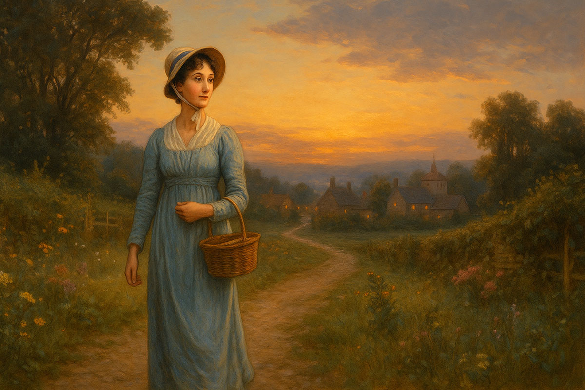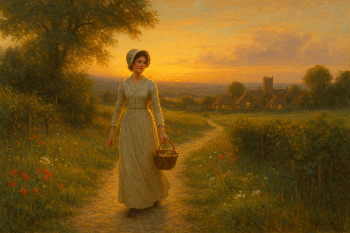 The evening light stretched long shadows across the meadow, the air holding that particular stillness that comes before nightfall. Jane walked the familiar path toward the village, her steps unhurried, the rhythm of the gravel underfoot almost meditative. In her basket lay a few sprigs of lavender, a small loaf of bread wrapped in linen, and a worn book she had been reading for the third time.