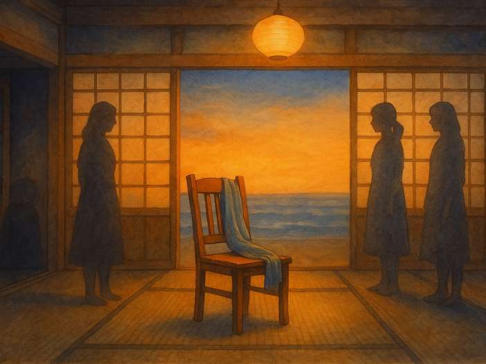 (They hold the silence. The cicadas return in a faint, uncertain rhythm, as if testing the air. Finally, Kiki lifts the shawl gently. They fold it together: Rei aligning corners, Ai tucking edges, Kiki smoothing. They place it on the cupboard shelf. The chair remains, plain wood again.)