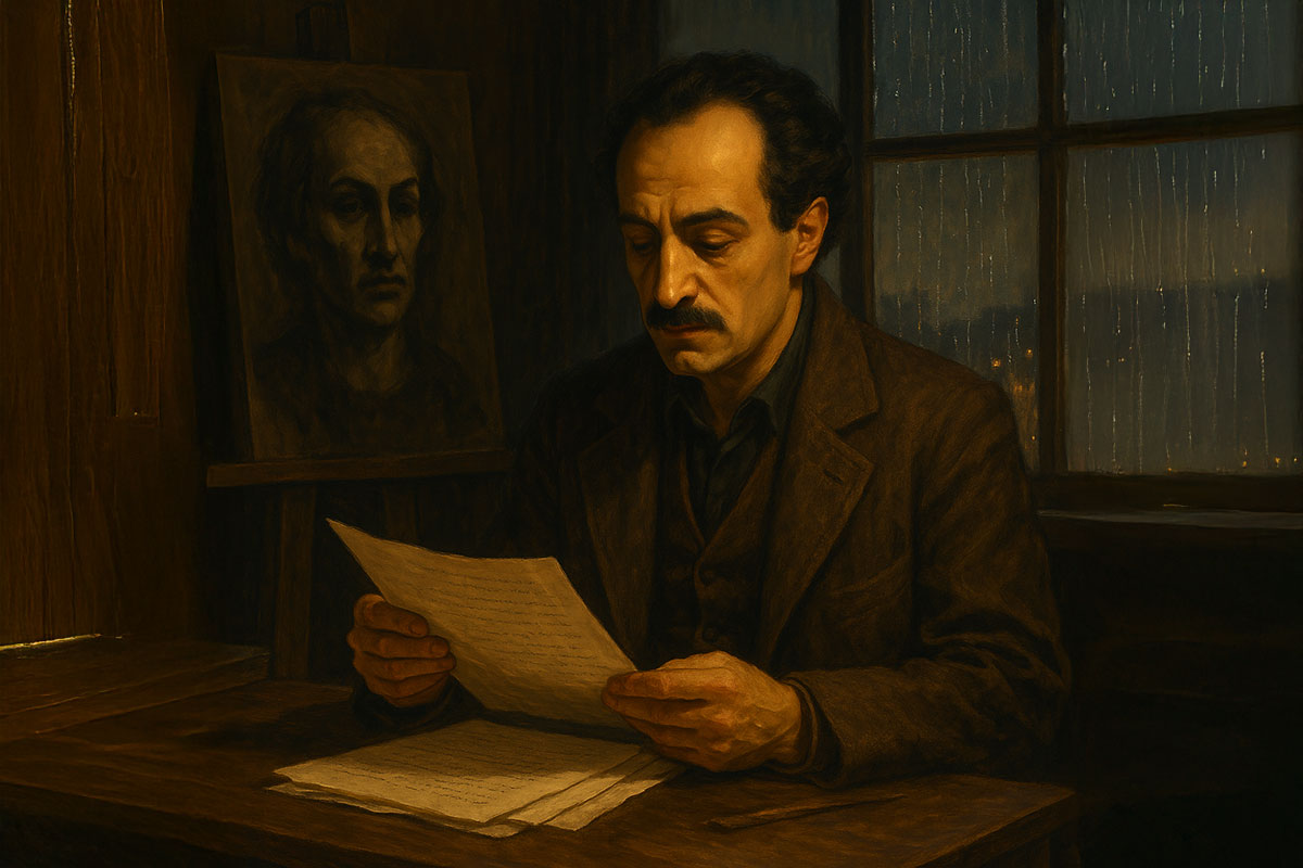 Khalil stood over them, hands ink-smudged, shoulders tense as a bowstring. On the easel behind him, a charcoal figure gazed out with that familiar, inward look—the face he kept sketching when words refused to come. The room smelled of turpentine and wet wool; the city’s pulse thumped through the floorboards.