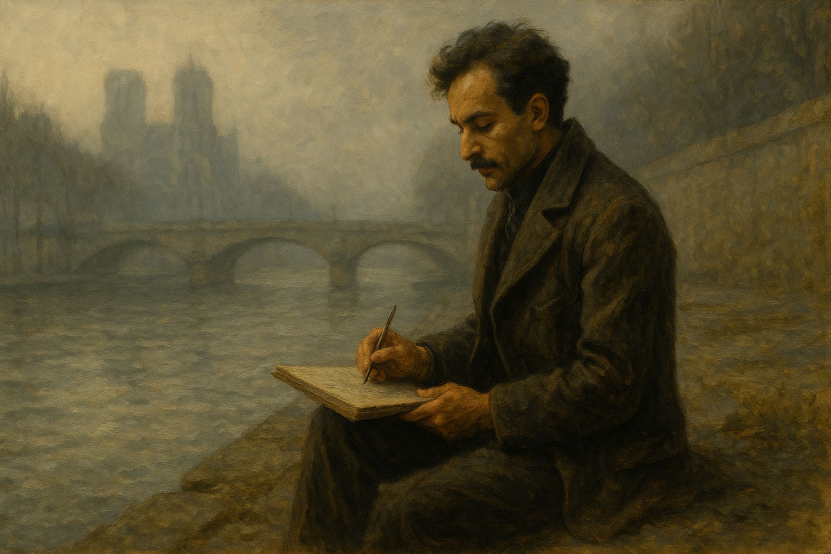 The winter fog in Paris rolled down the narrow streets like a living thing, swallowing the gas lamps and softening the edges of every building. Khalil walked with his coat collar high, sketchbook under his arm, his boots damp from the Seine’s mist.