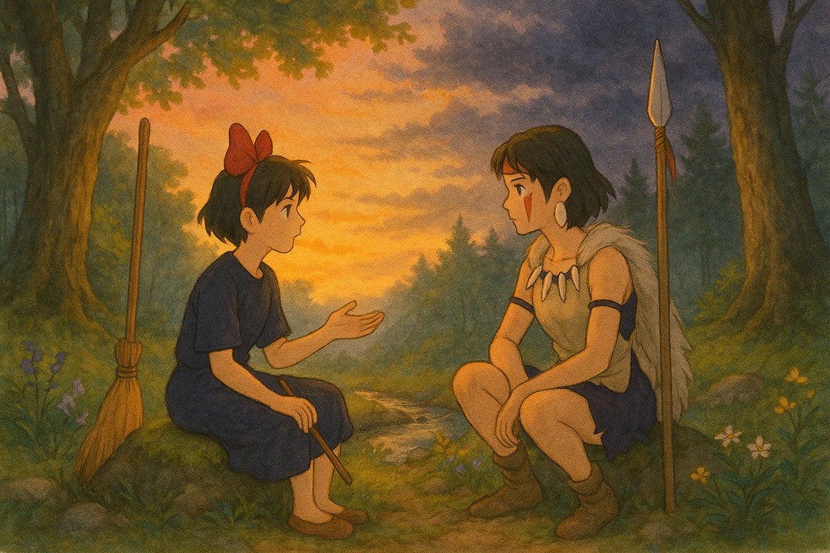 A mossy forest clearing where the trees part just enough to show a silver sky. Wildflowers grow between tangled roots. Kiki sits on a rock, hands resting on her broom. Across from her, San crouches near a small stream, face paint faded but fierce. The air smells of cedar and damp earth.