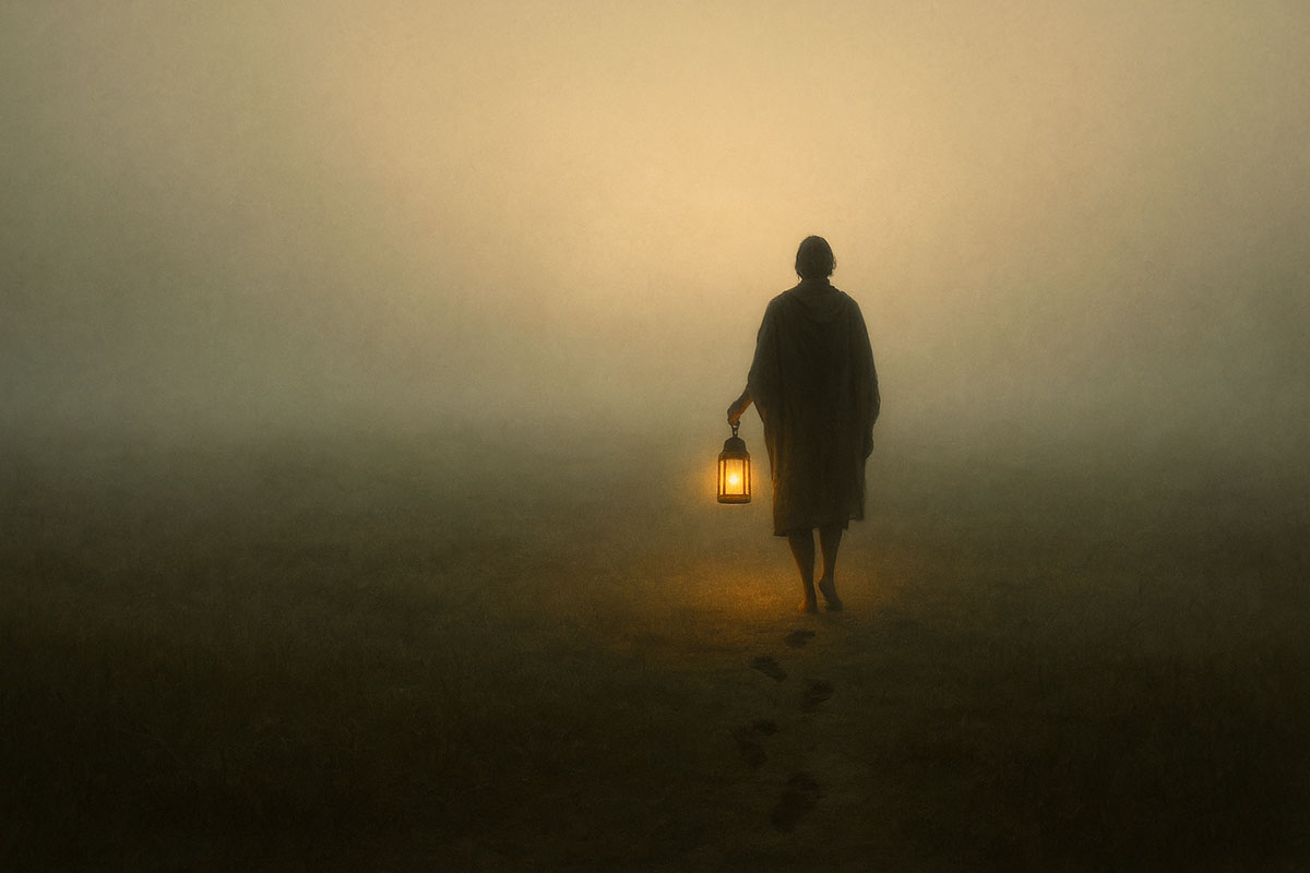 An open field under early morning mist. The sun hasn’t yet risen, and a soft silence lingers in the air. A simple wooden circle of chairs faces the horizon. In the center, a lantern glows faintly—its light a symbol of inner trust when the way ahead is not yet seen.