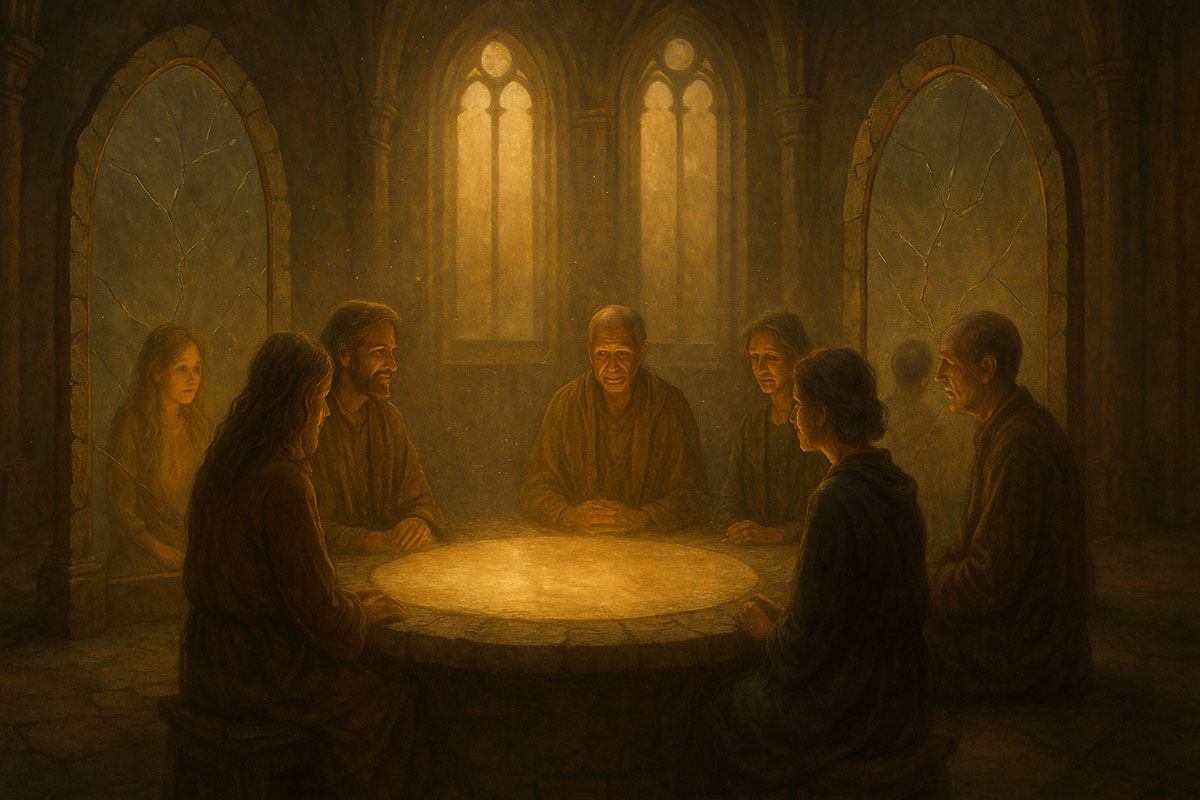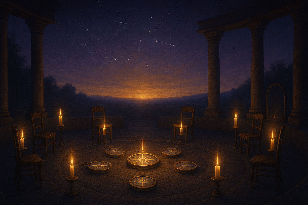 An open-air temple beneath a twilight sky. Around the roundtable, ancient maps are laid out—but they’re blank. Instead, each seat has a candle and a compass. In the background, faint constellations glow—familiar but unnamed. The atmosphere is both reverent and quietly electric.