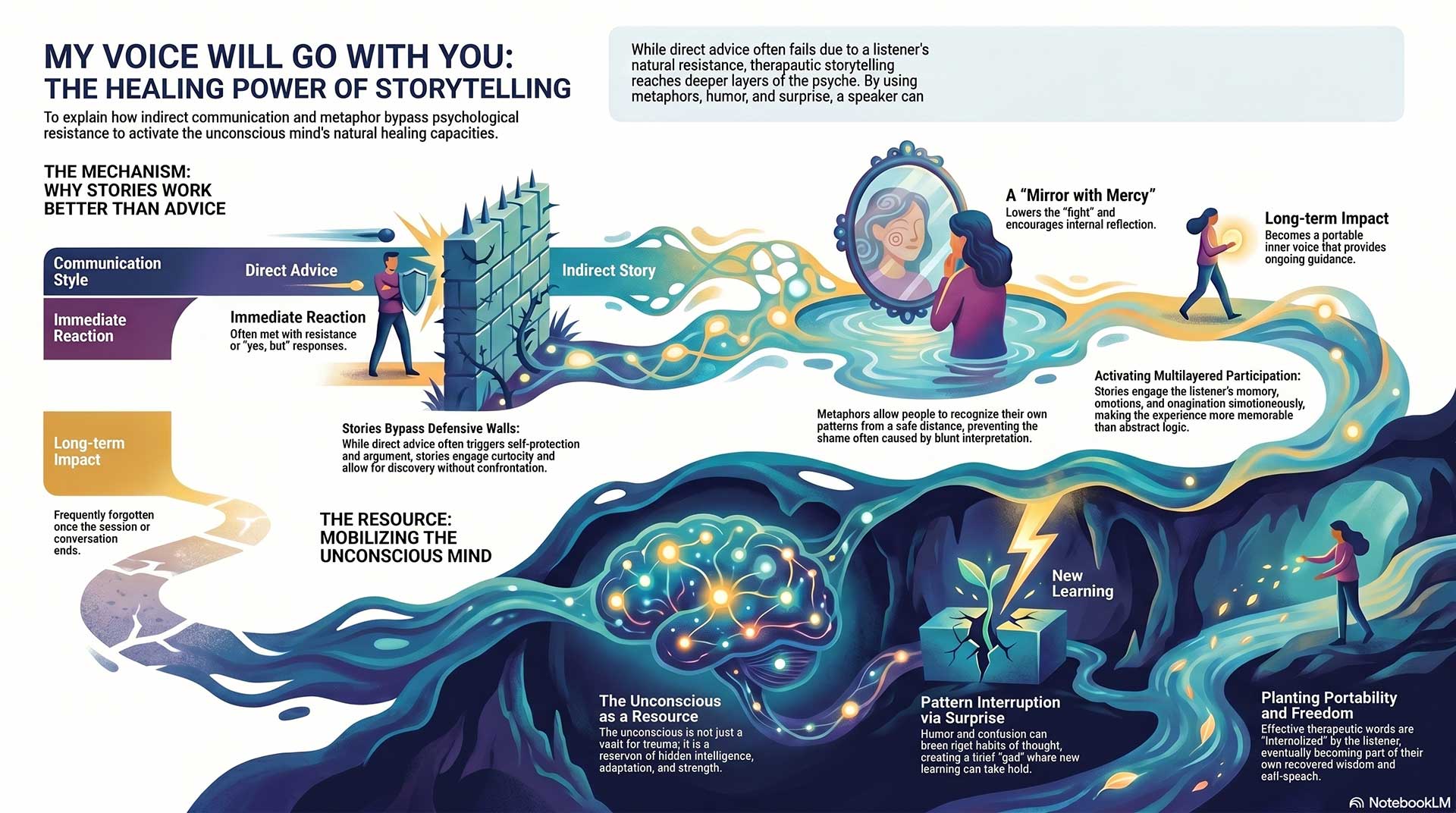 We now move into the heart of what made Dr. Erickson so unusual. Many therapists explain. Many analyze. Many interpret. He often told stories. At first glance, this can seem almost too simple. Why tell a tale when you could name the problem directly? Why circle when you could point? Why speak through image, memory, humor, or anecdote when the suffering person is sitting right in front of you?