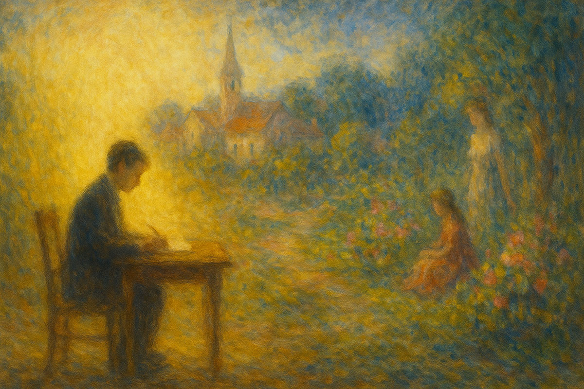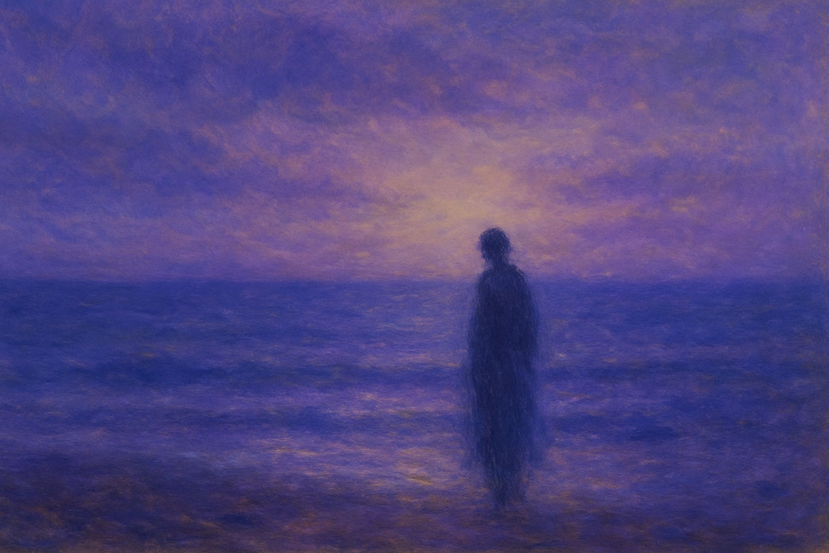 **Albertine’s shadow reappears, this time nearer, reaching a hand. He reaches back—she vanishes before contact.