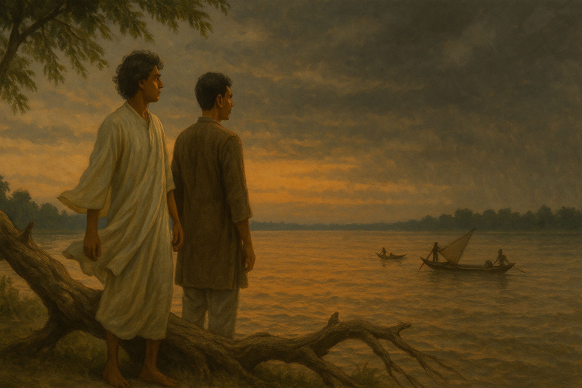 The Padma River lay before us like an unrolled scroll, each ripple a line of poetry too ancient for either of us to fully read. The evening air was soft but restless, the kind that hints at rain without yet daring to fall. We stood in silence, side by side, watching fishermen haul in their nets, their silhouettes swaying like brushstrokes against the copper dusk.