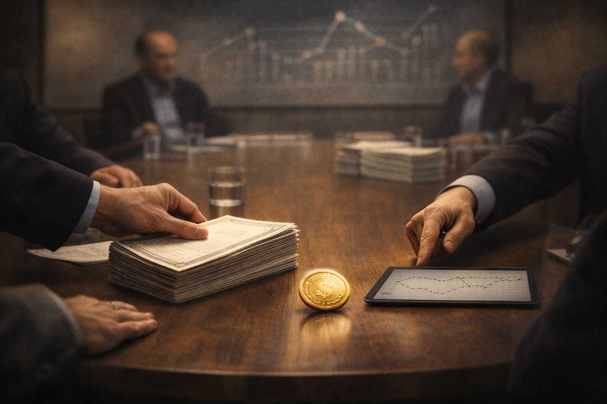 The roundtable is set inside a glass-walled library overlooking a city that never fully sleeps. On the table: a few plain index cards, a pencil, a single brass hourglass, and a small stack of old bond certificates tucked into a folder like museum artifacts. A large screen behind them shows only shapes and motion: a climbing curve, a tightening band, a sudden drop, then a slow rise again.
