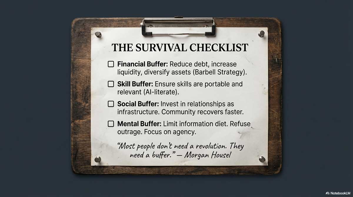 Morgan Housel: Topic seven is the survival playbook. Not the bunker fantasy. Not the doom scroll. A real playbook for regular people living through volatility. Inflation shocks. Job disruption. Political stress. Maybe periods of calm, followed by periods of chaos. The goal is not to be fearless. The goal is to be durable.