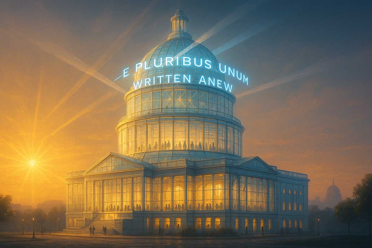 He looks upward, where ghostly words shimmer above the chamber—E Pluribus Unum.