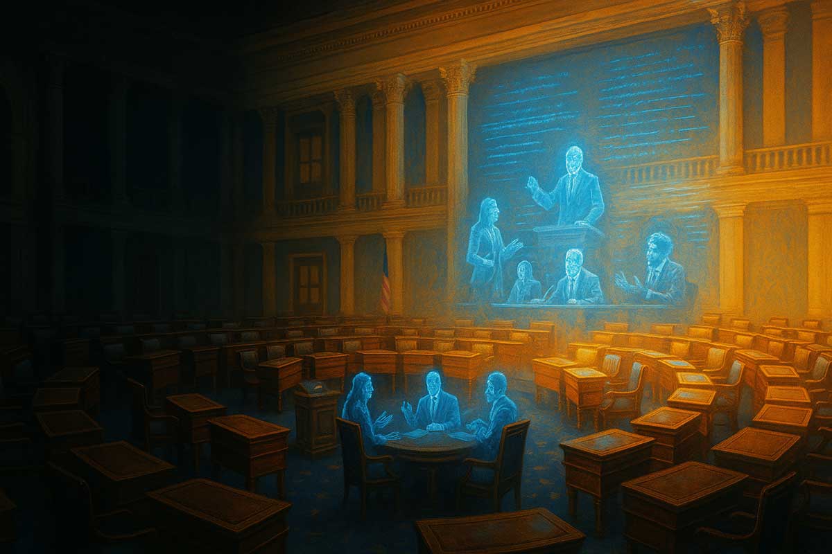 The Old Senate Chamber now flickers with holographic light. The desks glow faintly, displaying lines of code that dance like fireflies. The marble ceiling projects fragments of the U.S. Constitution, rewritten in living digital text.