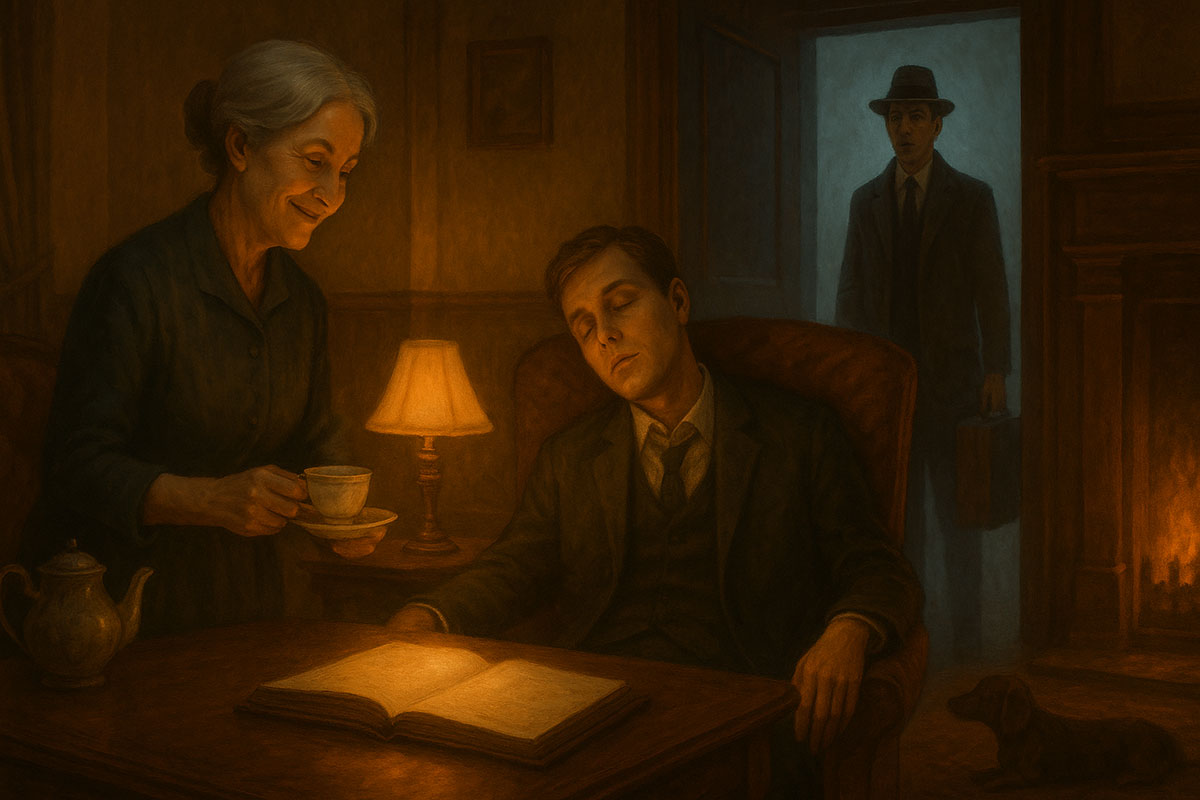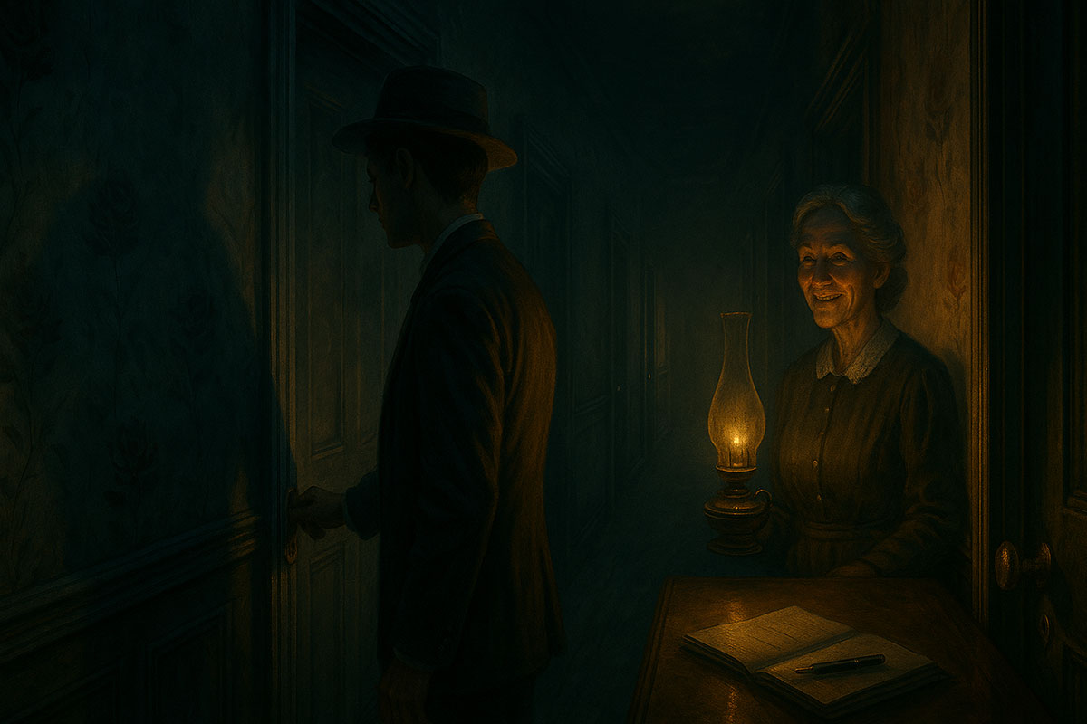 The landlady stands framed in amber: silver hair pinned perfectly, eyes the color of teacups, a smile already arranged as if his arrival completes the room.