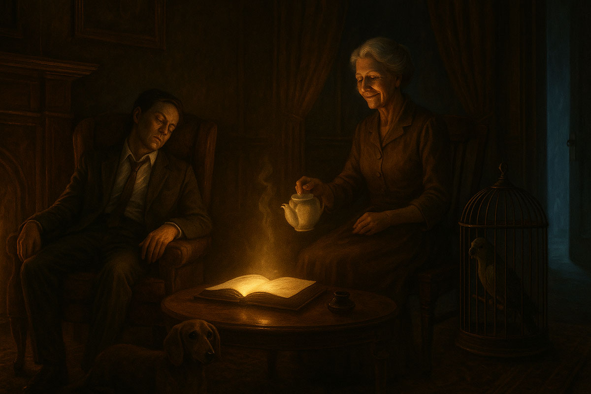Stage direction: As the door closes, the parlor tidies itself by degrees: the fallen saucer rights onto the tray; the fire lifts a little; the guest book’s page flutters, offering its margin. The dachshund’s glassy eyes receive a new reflection. The parrot becomes a comma awaiting the sentence to begin again.