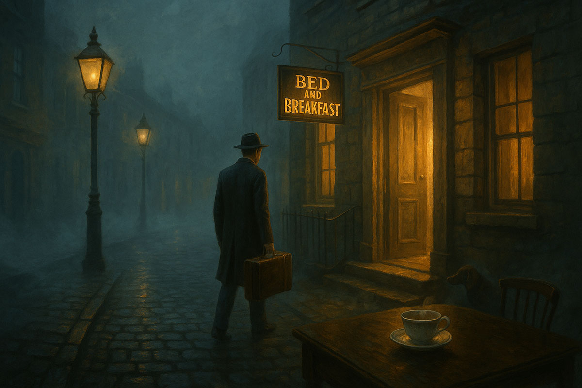 Setting: A fog-soaked street in Bath, 1950s. Gas lamps simmer in halos. The stones sweat with evening mist. Downstage right: a narrow townhouse with a brass knocker, lace curtains, and a hand-painted window card: BED AND BREAKFAST. A faint glow seeps around the edges of the door like a warm breath.