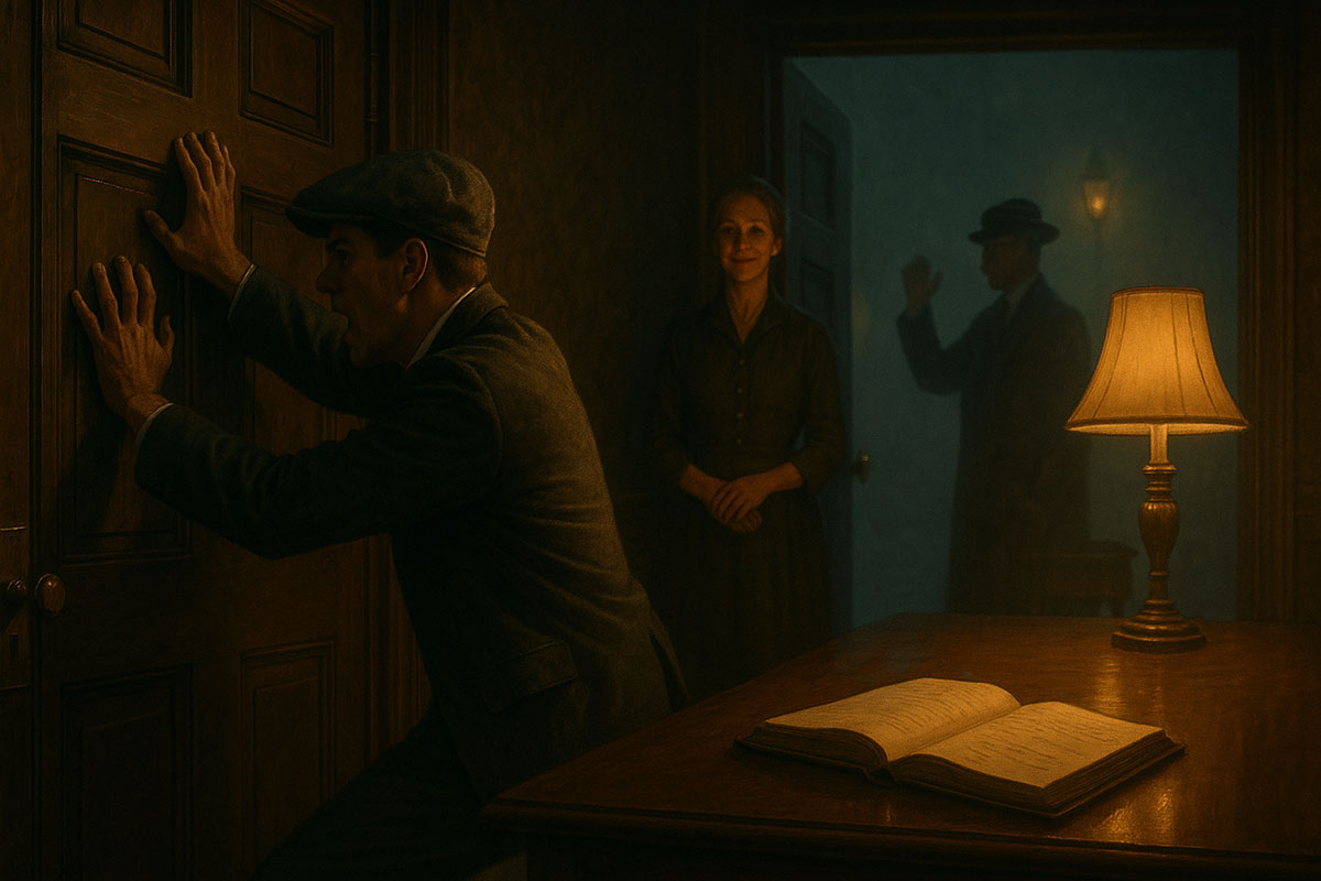 She does not ask his name. She steps back just enough for him to pass. He glances at the street—a life he could still choose—then crosses the threshold.